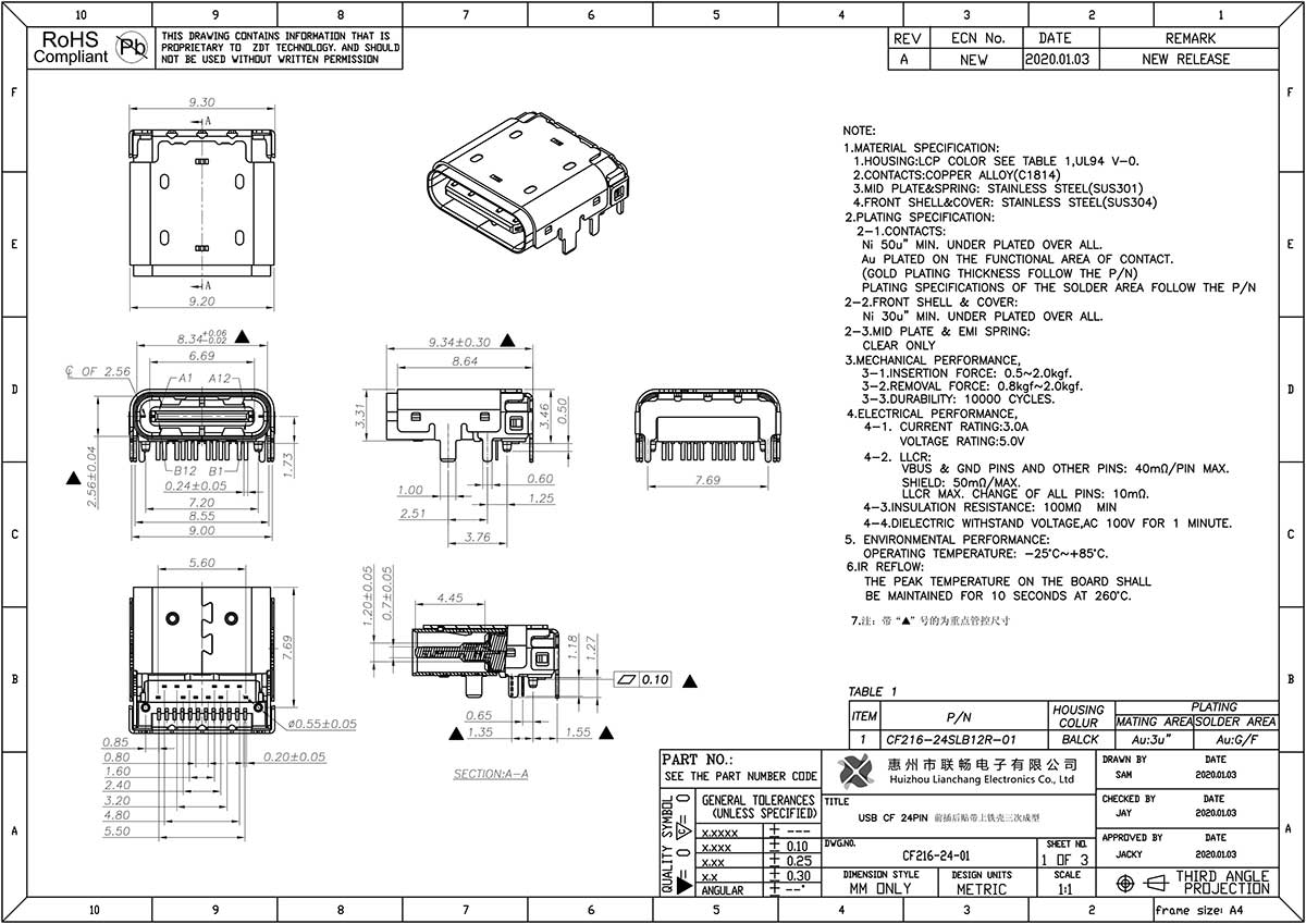CF216-24-01 USB CF 24PIN 前插后贴带上铁壳三次成型(仿连展款)