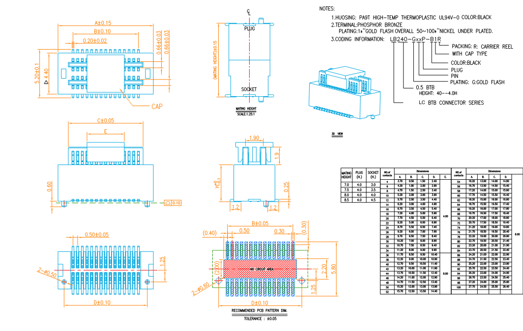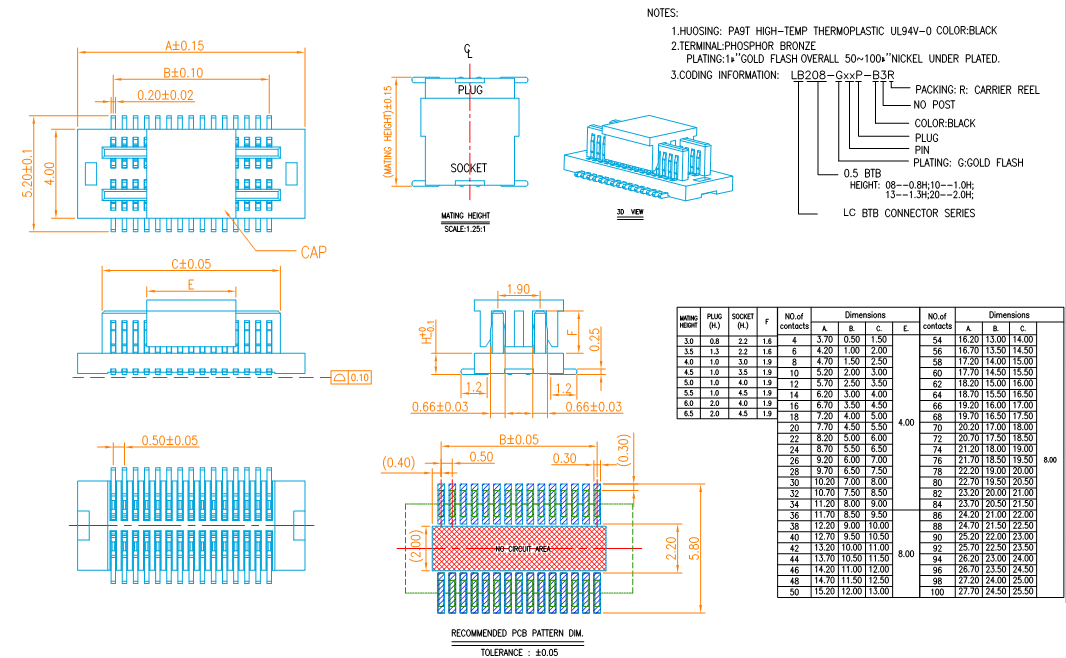 0.5 spacing double slot board to board connector 8-100P height H3.0-8.5