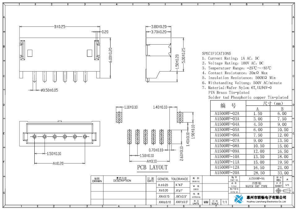 Terminal wire socket with a spacing of 1.5 and a height of 5.1. High temperature resistant WAFER connector with a height of 2-16 pins